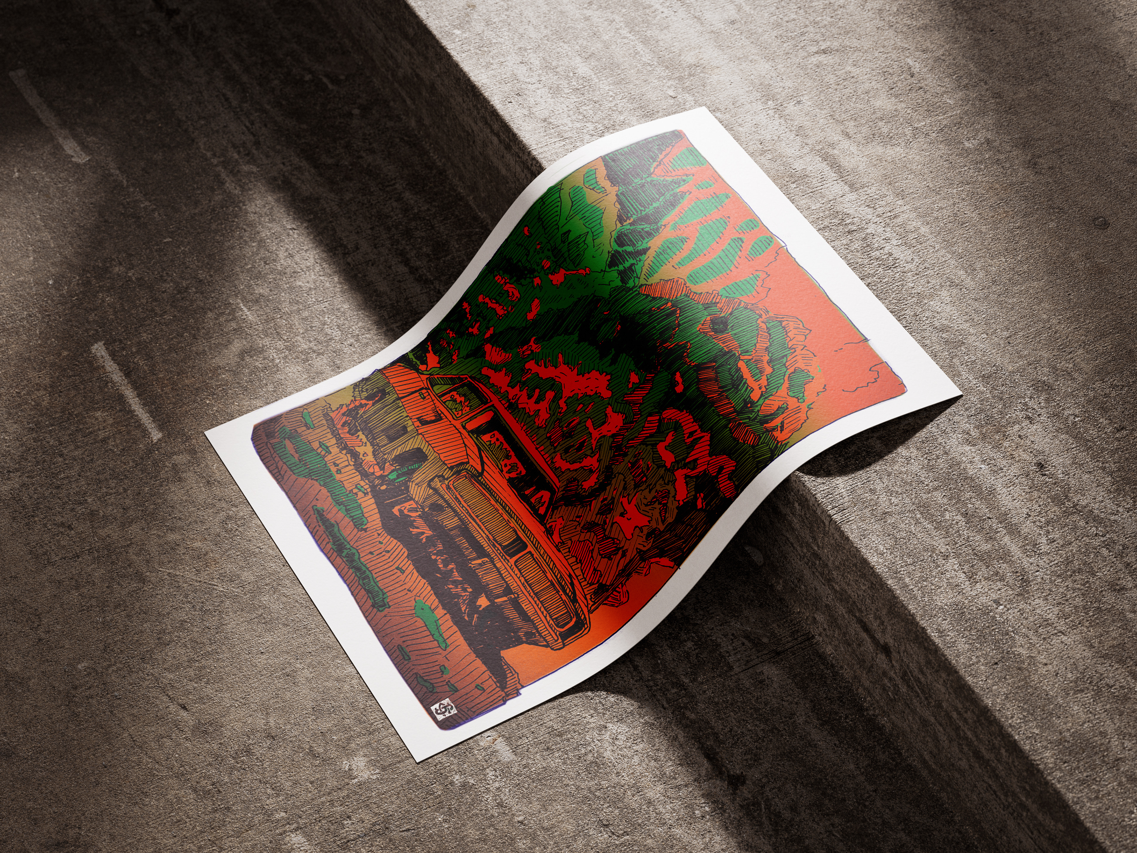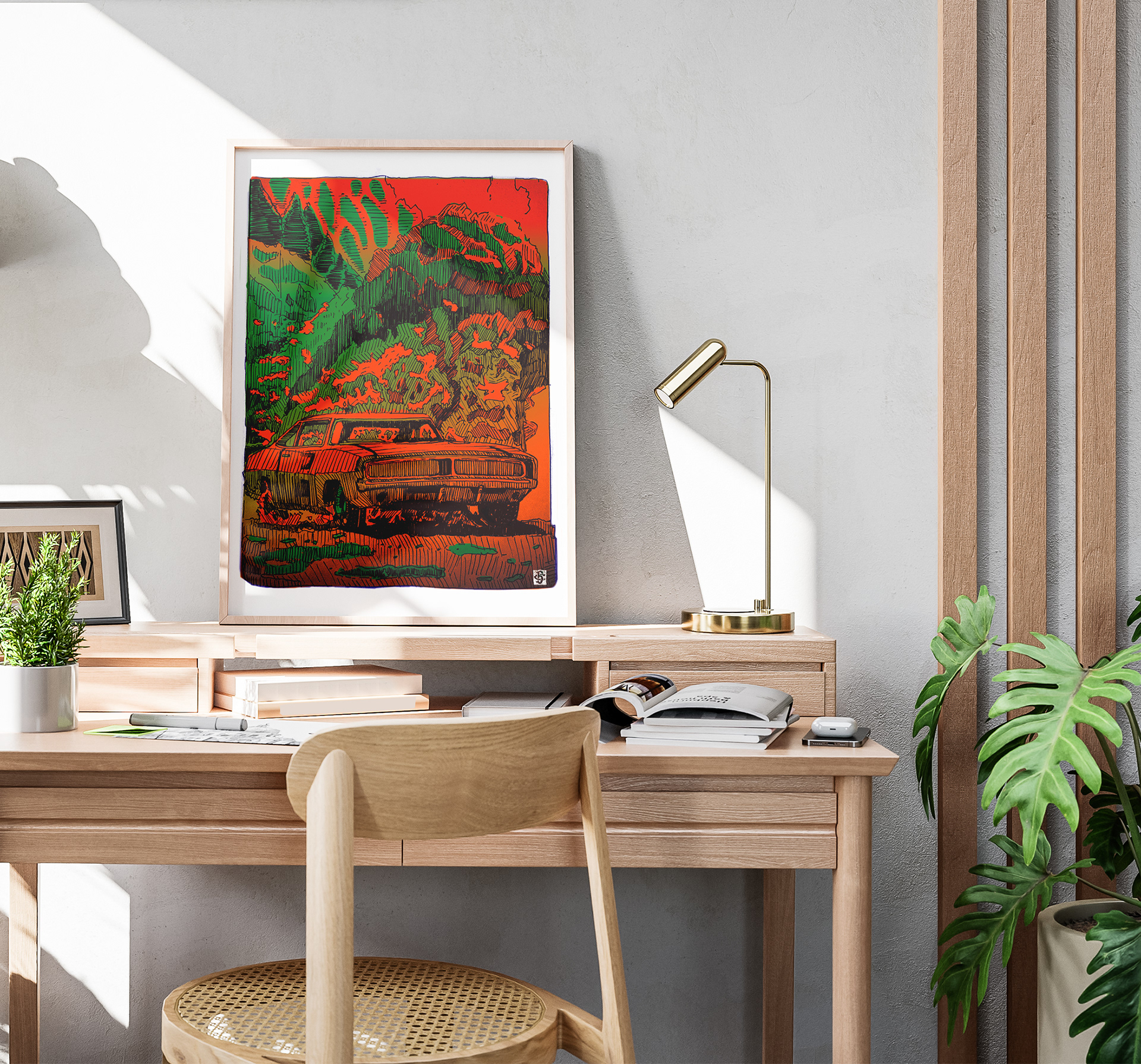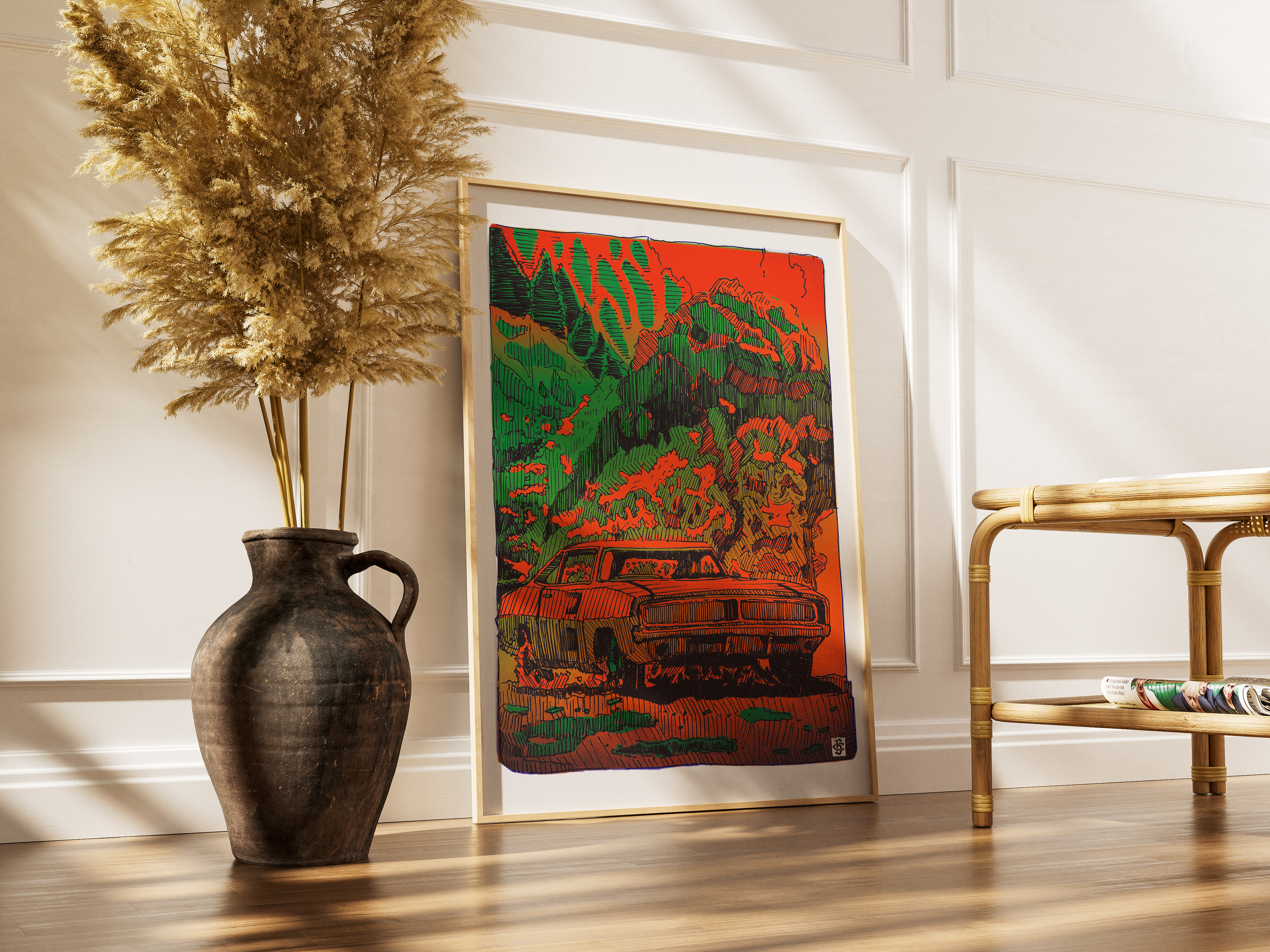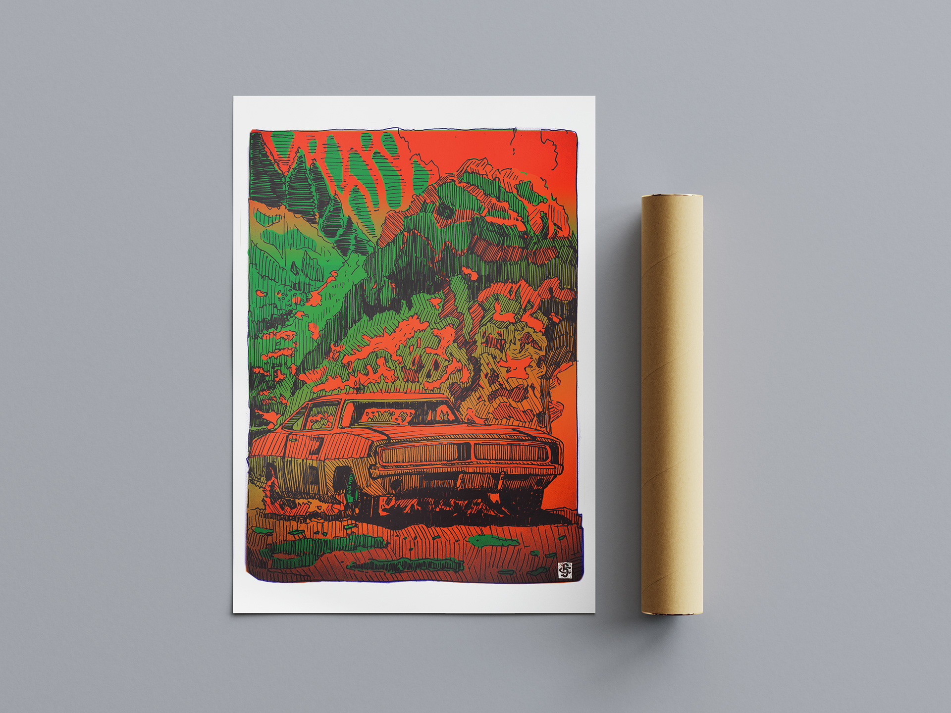 "A tribute to the raw power and timeless silhouette of American automotive history. This edition explores the tension between industrial weight and the ghostly vibration of the risograph process, capturing a static moment in a never-ending journey."