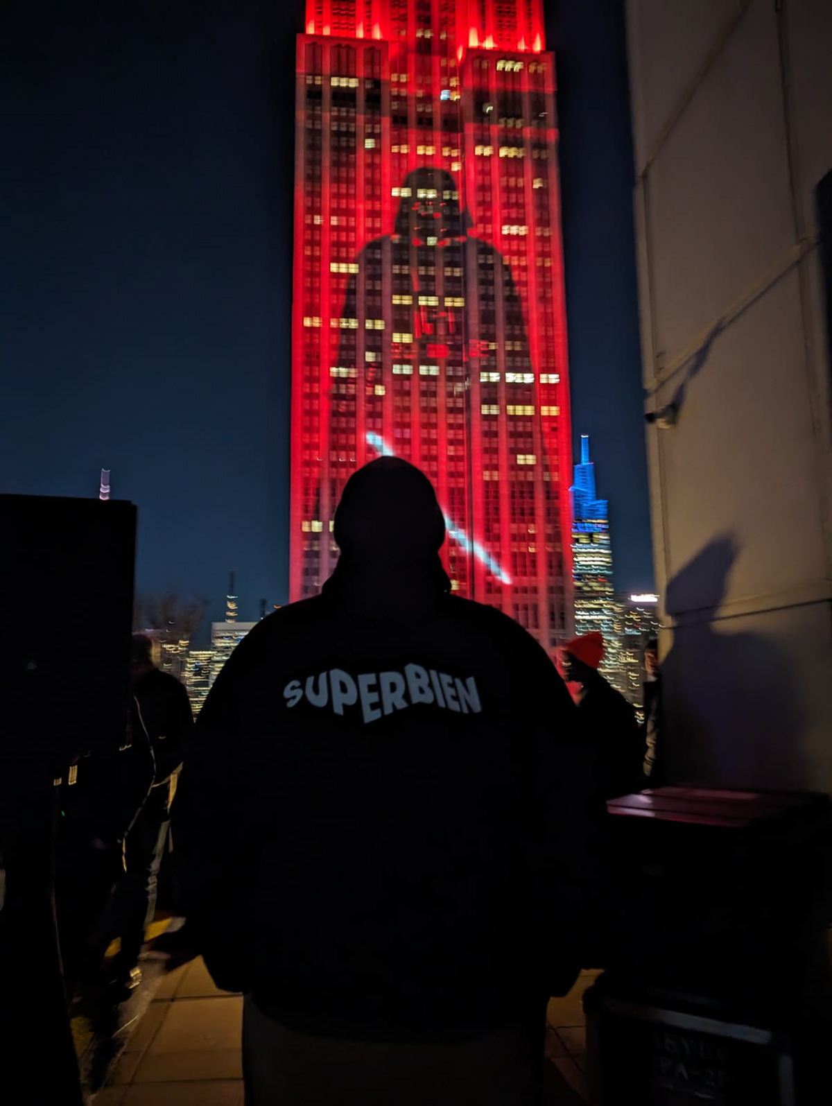 In the 2 weeks between delivery of the aforementioned assets and the takeover itself, Superbien finessed and seamlessly blended 5 decades worth of footage, featuring everyone from Darth Maul and Emperor Palpatine, to a sea of Storm Troopers and Lord Vader himself. Always up for a challenge, the Superteam optimized all the footage for projection mapping on an almost 700-foot canvas, focusing primarily on opacity, matte coloring and per-frame scene adaptations. Between motion design and creative direction, Superbien was able to be responsive and reactive to ILM’s vision and feedback and deliver a wildly successful and super striking activation, green-lit by ILM’s own Visual Effects Supervisor, Khatsho Orfali.